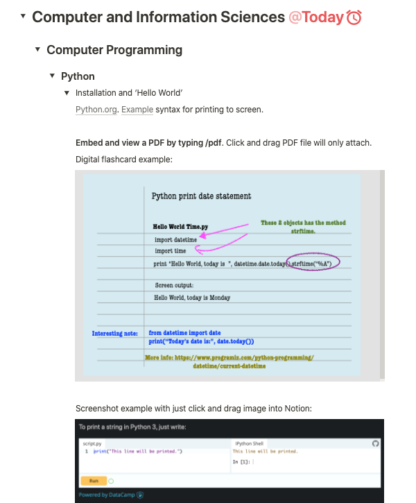 Flashcards and Notes Notion template is a simple design that is meant to be easy to use for studying focus. It has a self-explanatory example toggle block for learning how to master the basics. And another short example toggle block for Computer and Information Sciences.